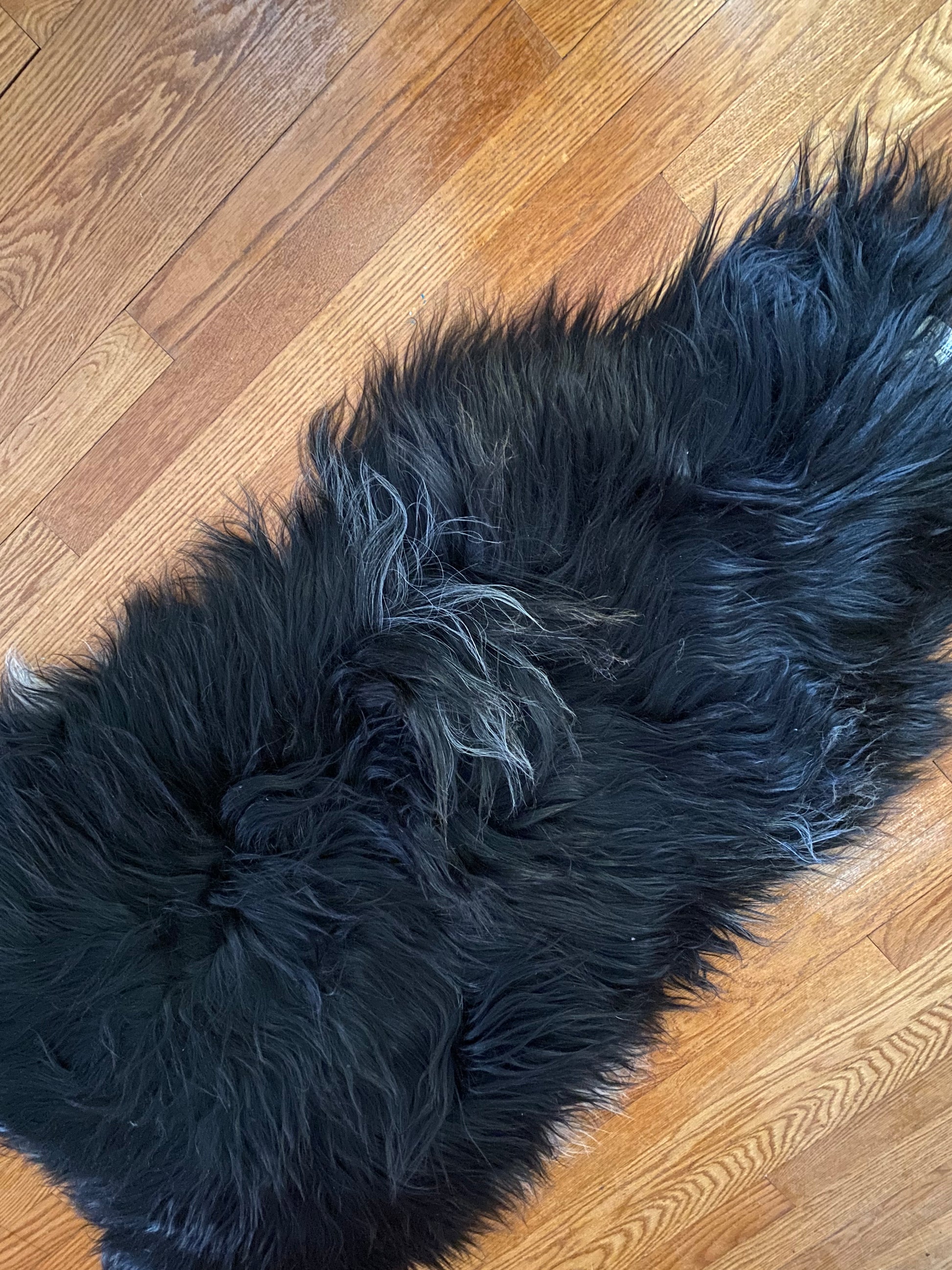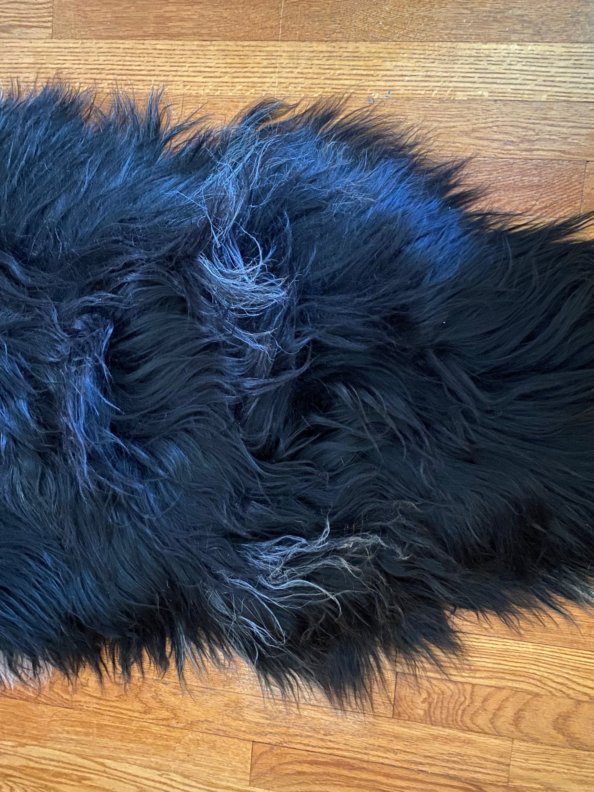 While still a very large sheepskin, this one is a bit more manageable for those of us on the smaller side. It is another true-black, seriously shiny, spectactular sheepskin but with distinguished threads of silver in the black and two very narrow bands of white on each side. A more elegant and distinguished look - the Chanel of barbarian wear. Impress those Vikings with this gorgeous, pillowy fleece!