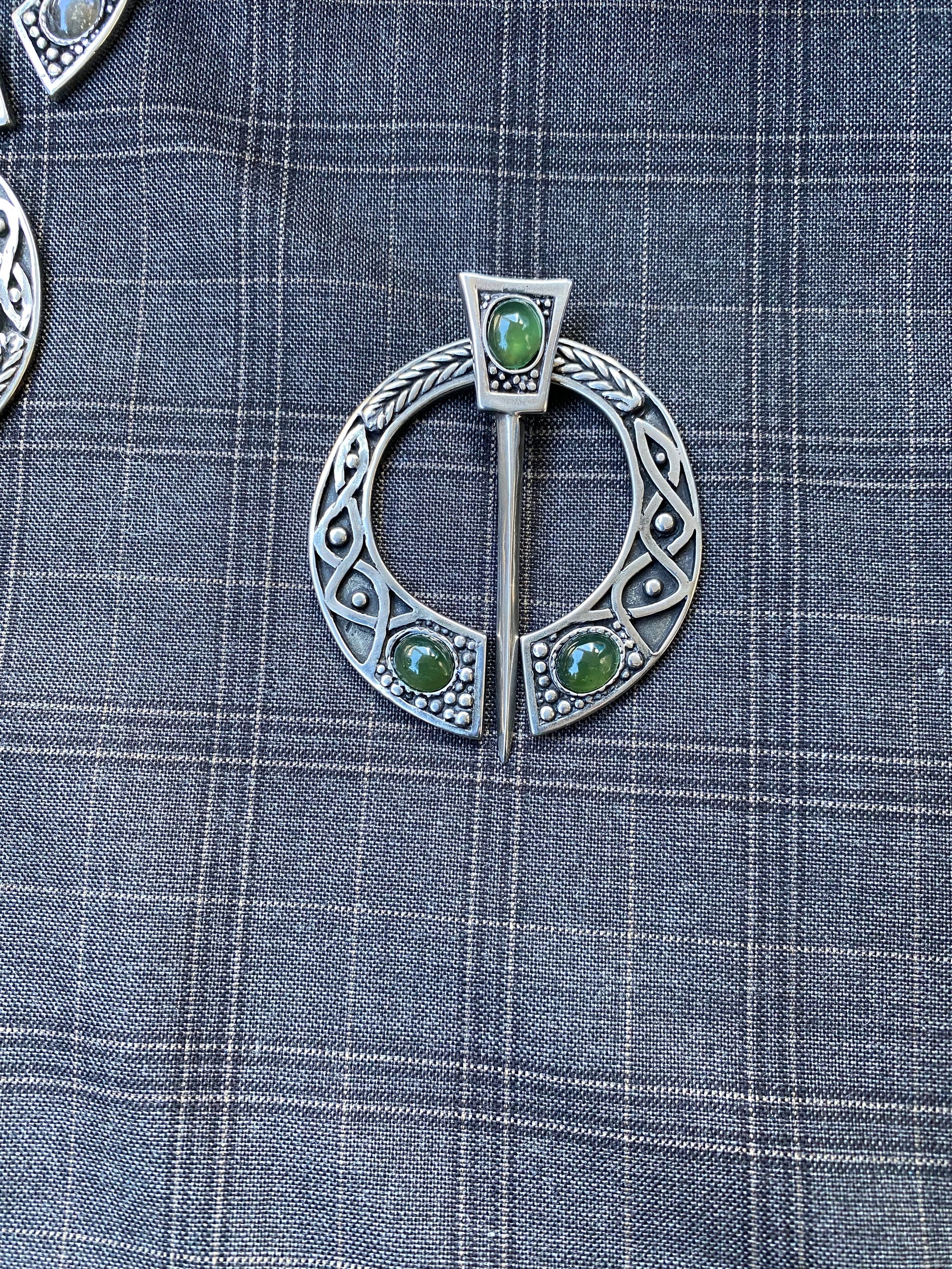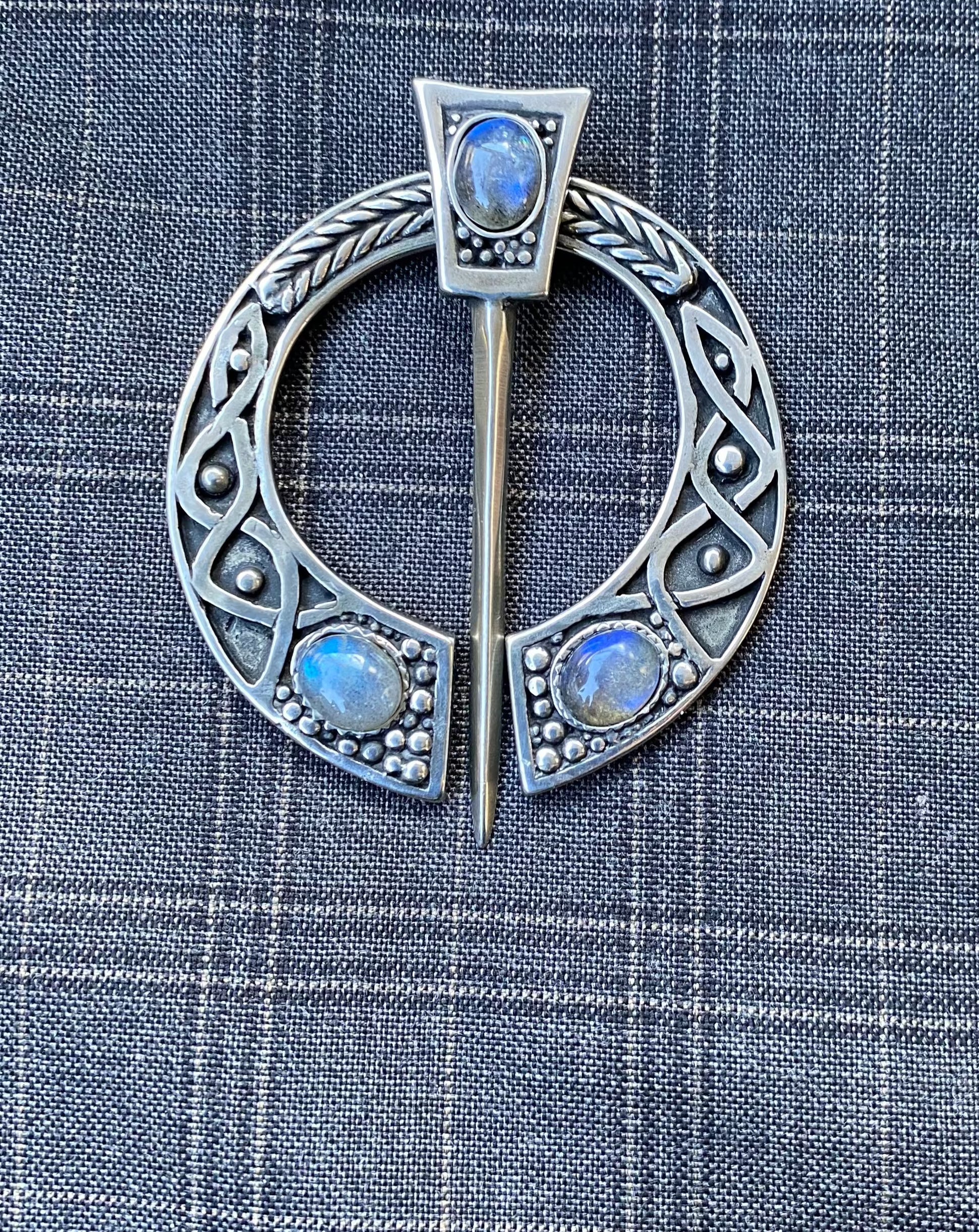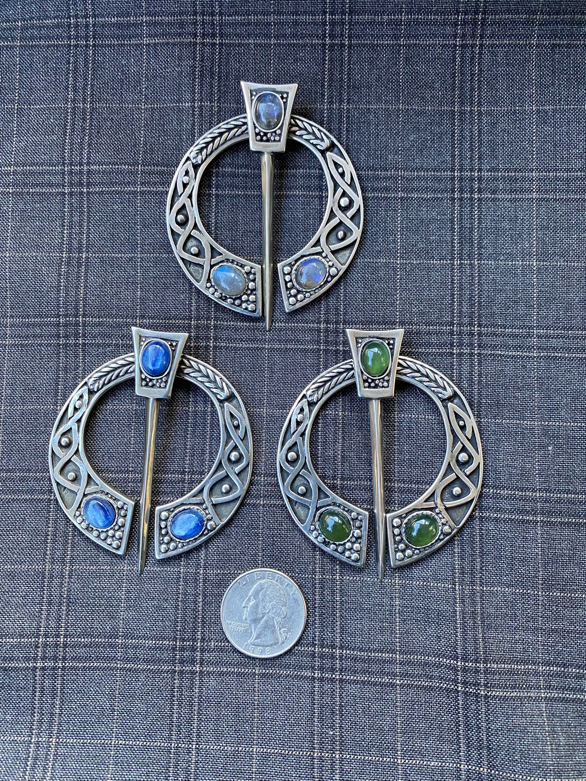 Hand cast white bronze, this brooch measures 2 3/8 inches across and the pin is 2 3/4 inches long.