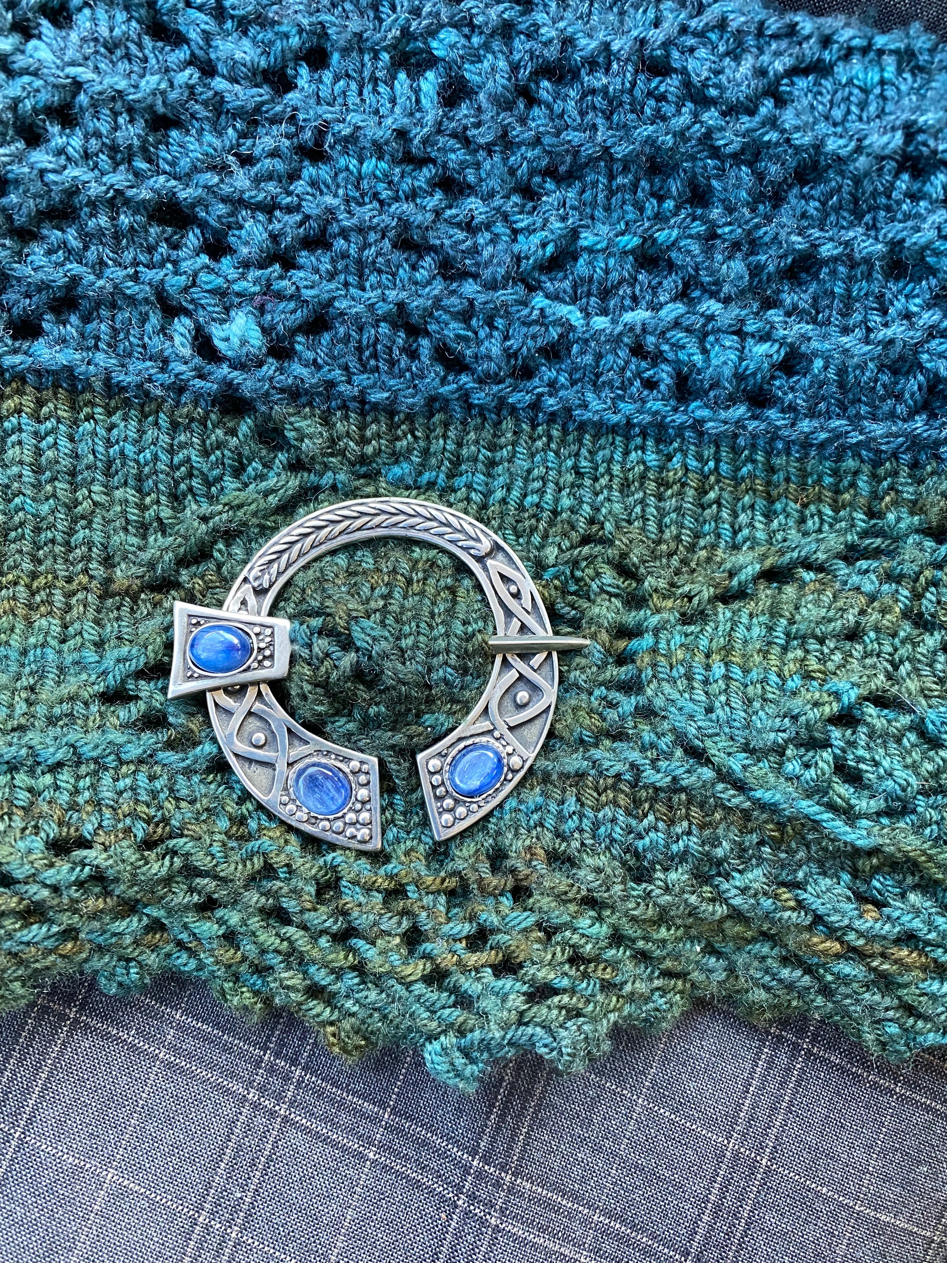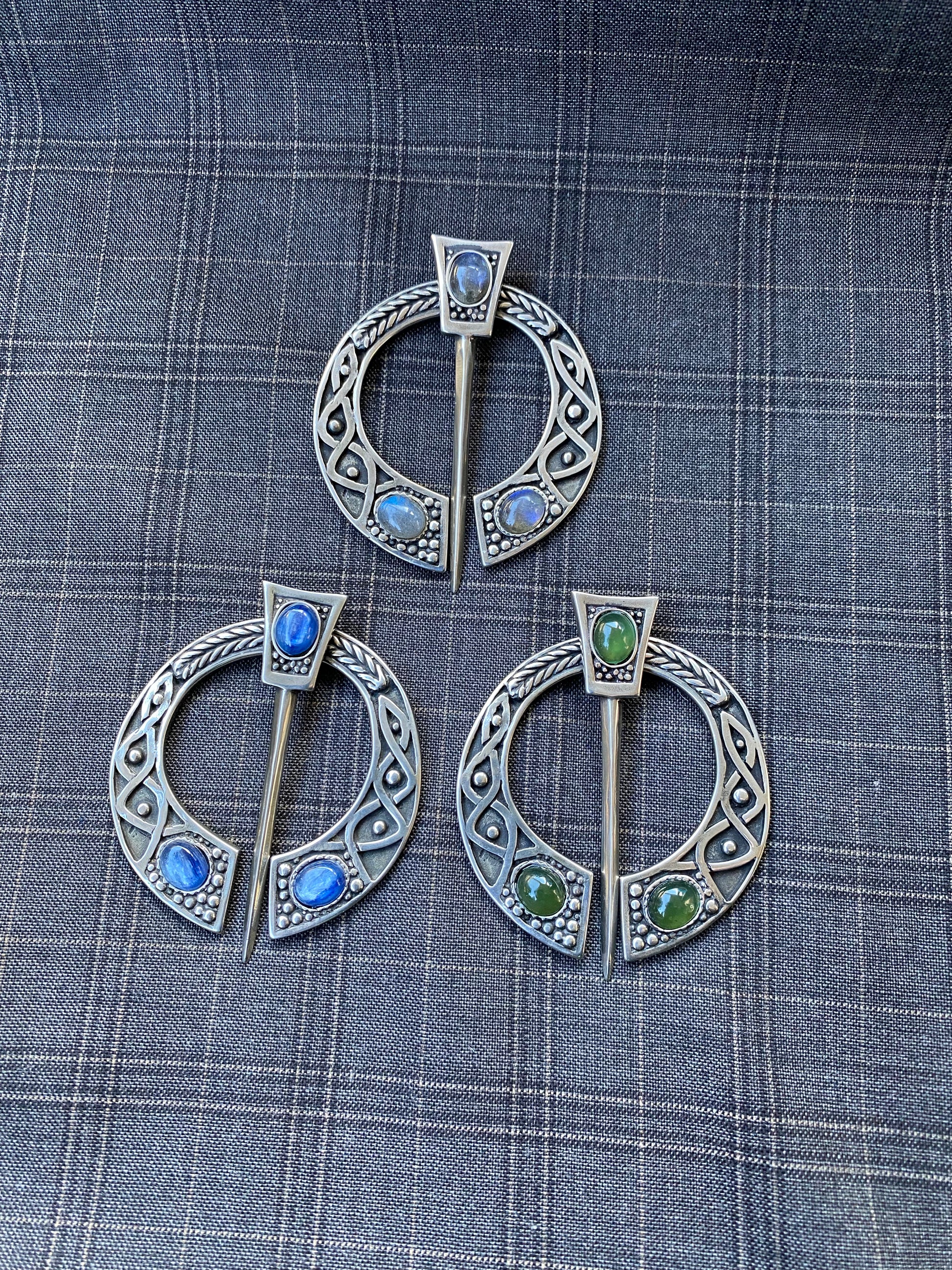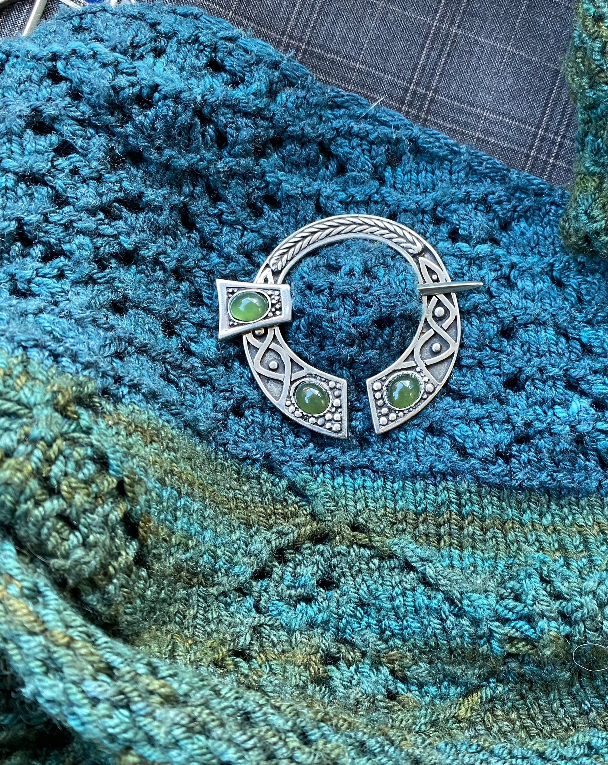 Hand cast white bronze, this brooch measures 2 3/8 inches across and the pin is 2 3/4 inches long.