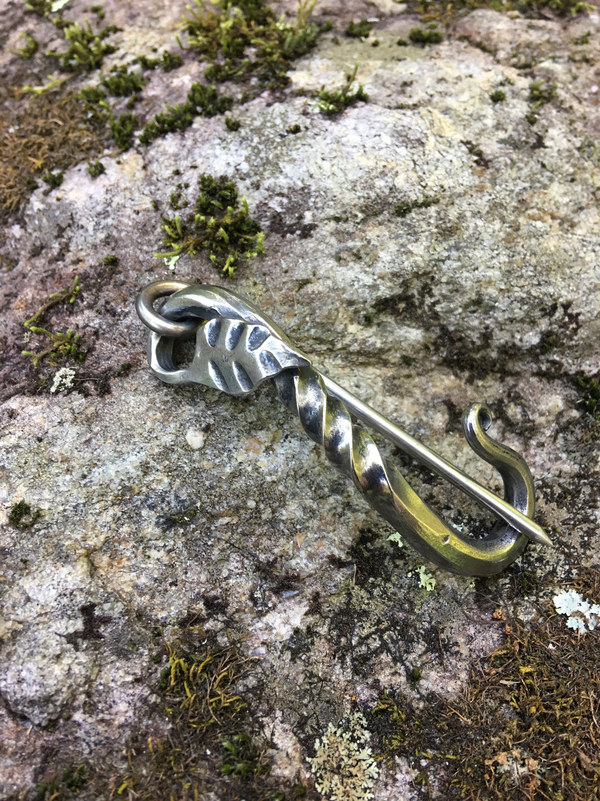 This is a great modern take on an bronze age design. Hand forged stainless steel by master blacksmith Christopher Dietz , this diverse pin is the perfect addition to your re-enactor kit or as a closure for your hand-knit shawl.
