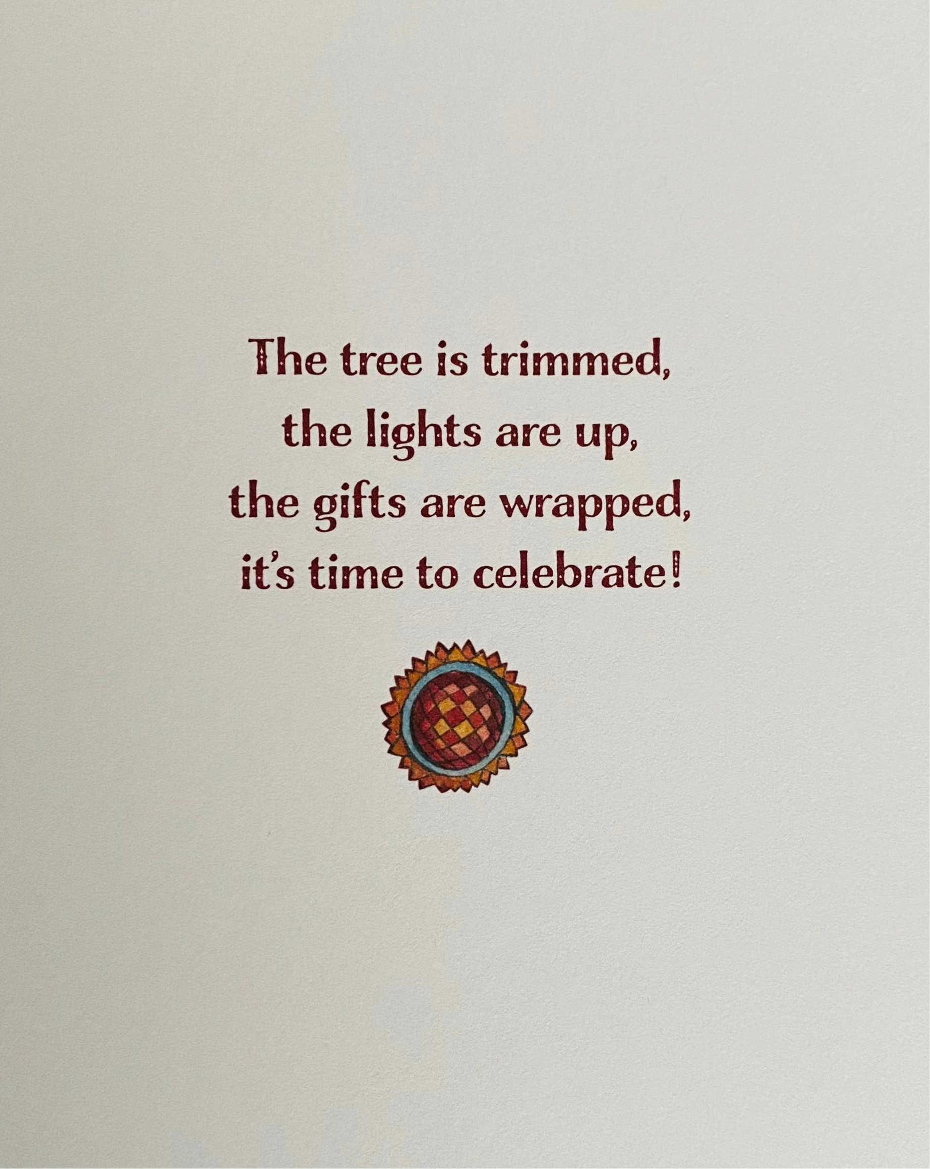 Inside greeting - “The tree is trimmed, the lights are up, the gifts are wrapped, it’s time to celebrate!”