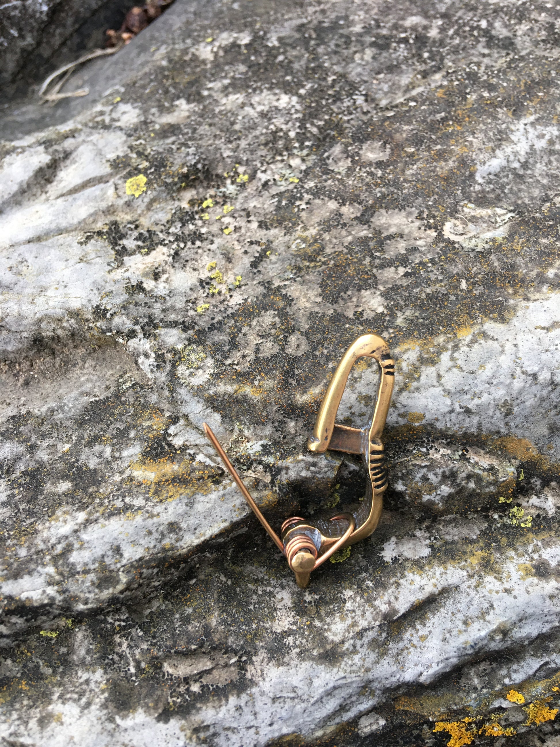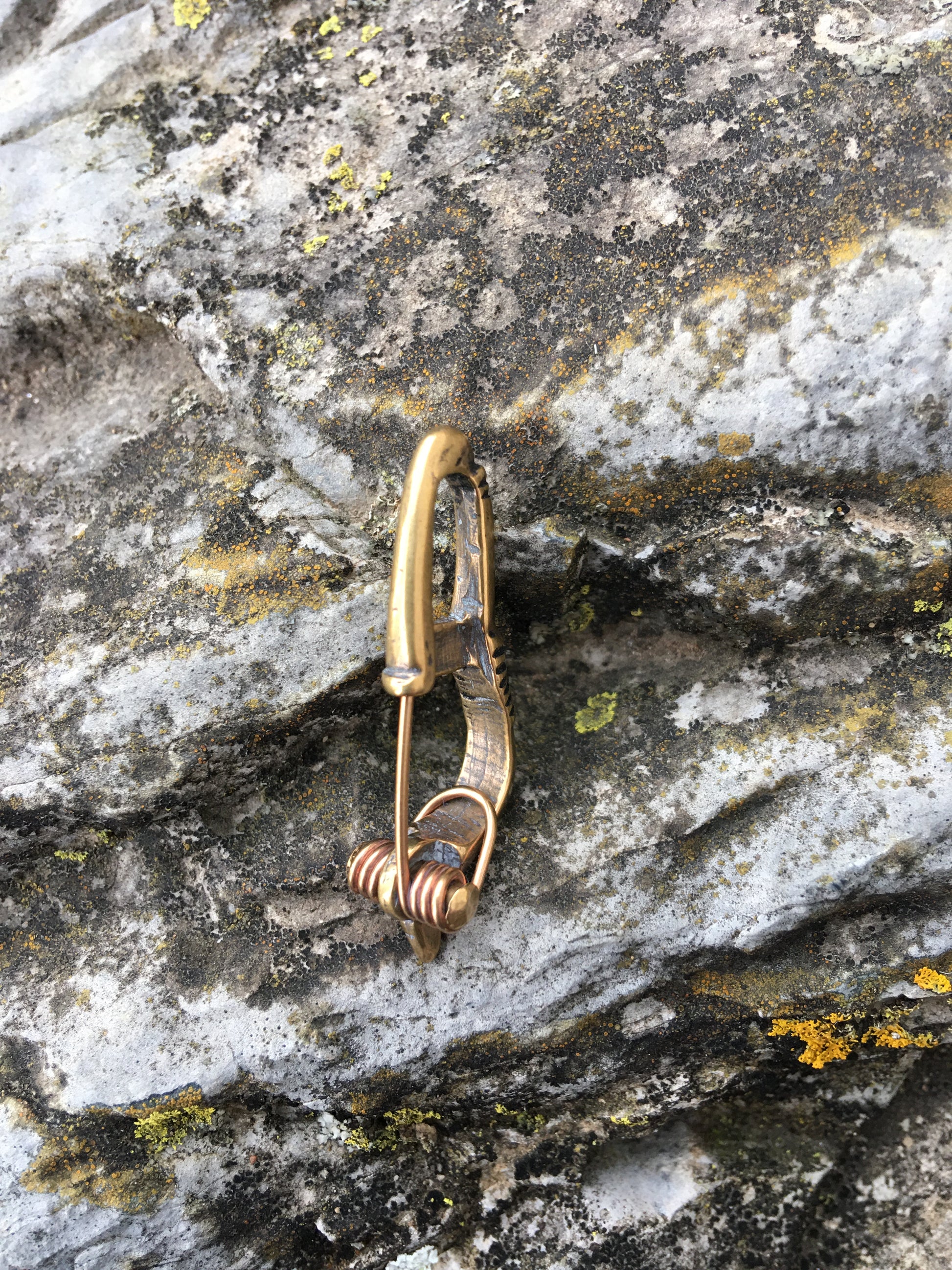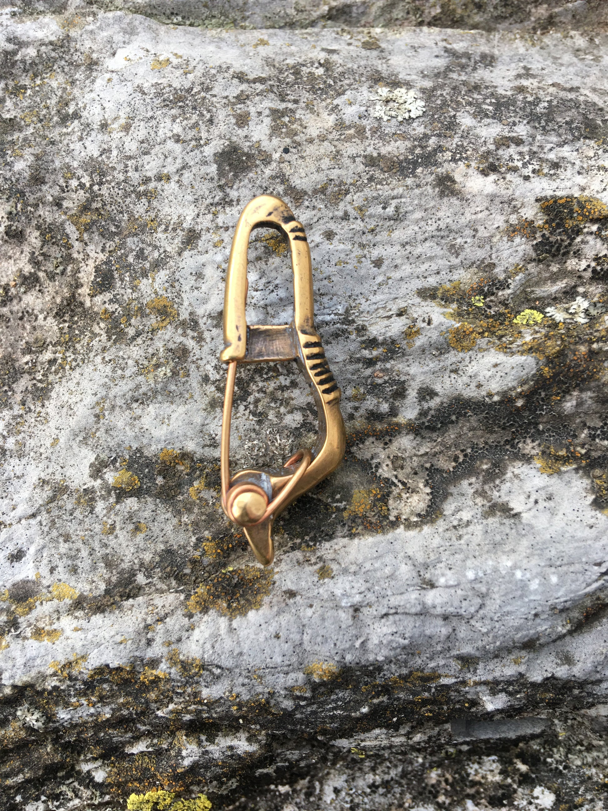A fibula is an ancient fastener, first developed in the Bronze Age, used mostly to fasten clothing or cloaks. Though the name ‘fibula’ originally was used only for pins of Roman origin, it has come to be used for any ancient fastener with an elongated body and a hinge or spring attaching the pin. This is, in fact, the ancient predecessor of the modern safety pin.